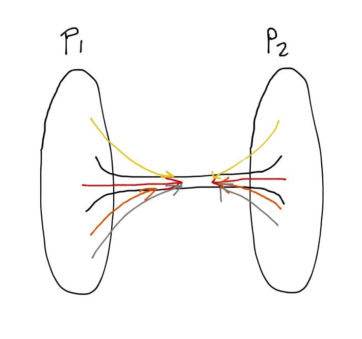The figure below is a very crude diagram; however, it is sufficient to give you a generalized idea of what an energy link is. In the diagram, P1 and P2 refer to people and the circles their auric fields. The black lines represent the link we forge with another, though the shape of it can vary dramatically. In addition, the red lines represent our reaction, say anger that we direct at them, and that they direct back at us. The other lines, yellow, grey and orange represent other issues (even linkages) we may have with the person that can become part of the link we are manifesting, ones such as I described in the previous paragraph. Do notice that the lines terminate within the two auric fields, that that is where the links terminate.