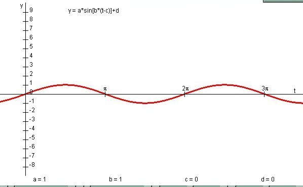 Let us say that figuratively, this curve describes a simple thought of only a few attributes (the attributes being the variables in the equation). Now, no two thoughts are alike, so even though two simple thoughts can have some of the same attributes, that is the values of a, or say d could be the same, yet the equation would result in the sine curve having a different shape. Change these values and the curve may be higher, steeper or longer.