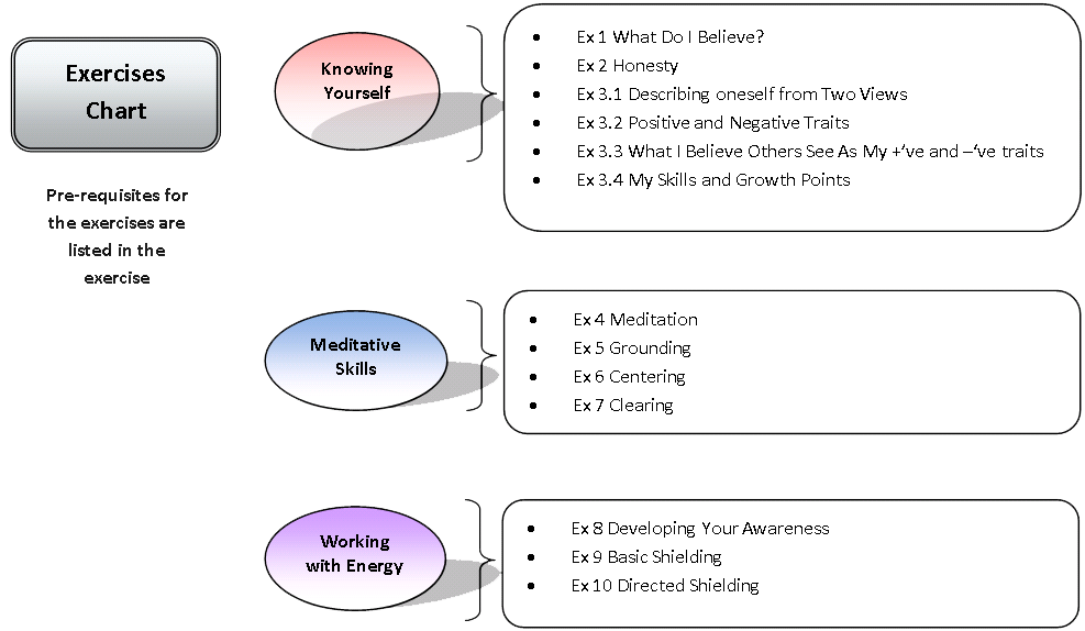 The exercises presented here are to aid you developing awareness of yourself. References to the majority of the exercises are in individual essays. However, the essays cover a great deal and so I have left some unreferenced. Each has a prerequisite and assuming you are following the suggested reading only the essay it was referenced from or the one most pertinent to the exercise is listed. They are designed to help you put into practise some of what was covered in the essay. This expands the depth of your awareness of the topic and assists you in either starting or further developing your awareness.